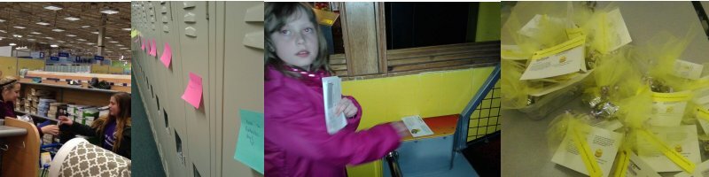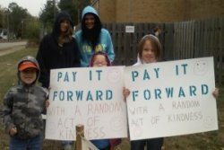 Our Pay It Forward Club goes out an does random acts of kindness also. They have left friendly post it notes on over 500 school lockers, left candy bags in teacher lounges, given out flowers at stores, left quarters on video games at arcades, made and gave out inspirational paper fortune cookies, went caroling at nursing homes, and blew bubbles at a surprise wedding reception.